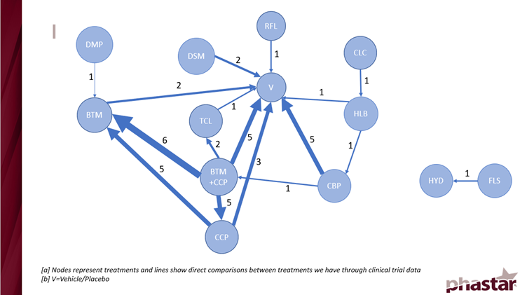 Whilst this analysis may have struggled to provide indirect comparisons with meaningful confidence intervals, under the right conditions, results from a network meta-analysis can be useful to drive decisions for future trials and provide direction to sponsors regarding the performance of their treatments against competition.